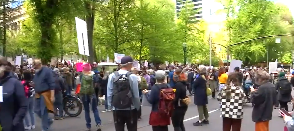 5月14日星期六,超过1000人涌入波特兰市中心,表示团结一致支持打胎权(堕胎权)。