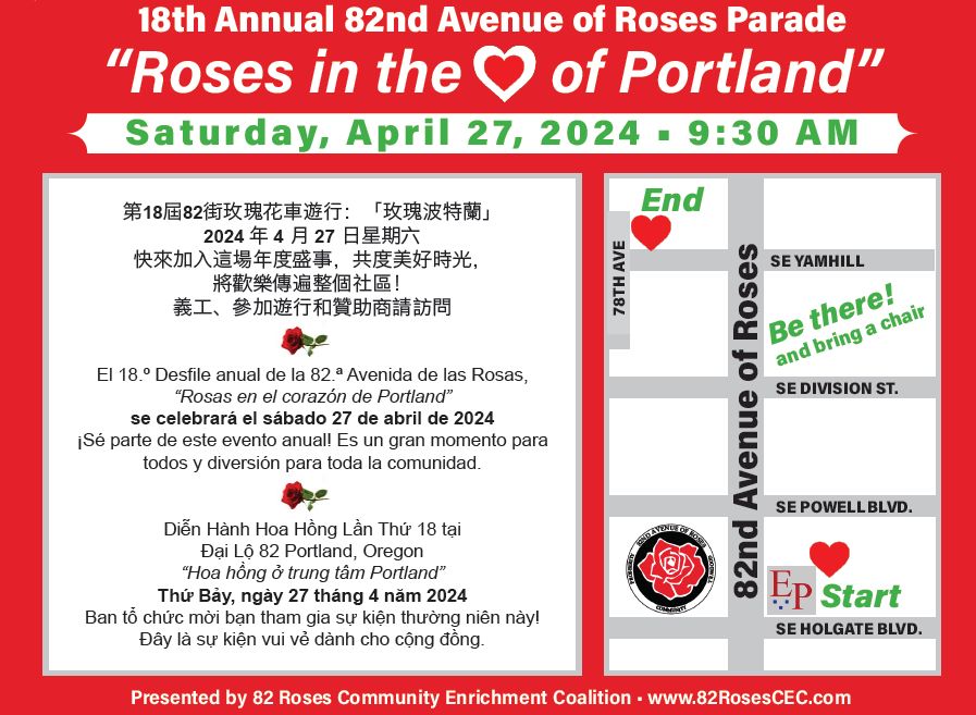 根据介绍,波特兰82大道(或称82街)的玫瑰节花车游行开始于2007年,到2024年,已经是第18届。游行路线周边地区的华人、越南人、黑人、土著人居民比例很高,超过60种语言,是个多元化的社区。