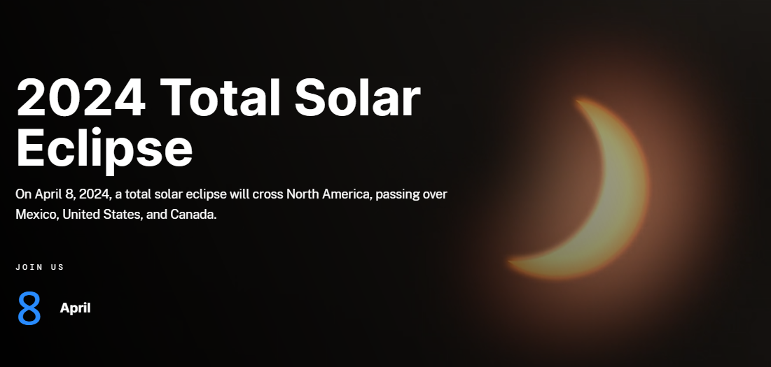 美国国家航空航天局 (NASA)宣布,2024年4月8日,日全食将穿过北美,经过墨西哥,美国,和加拿大!到那时, 月亮经过太阳和地球之间,部分或完全挡住太阳,发生日食,天空变暗!