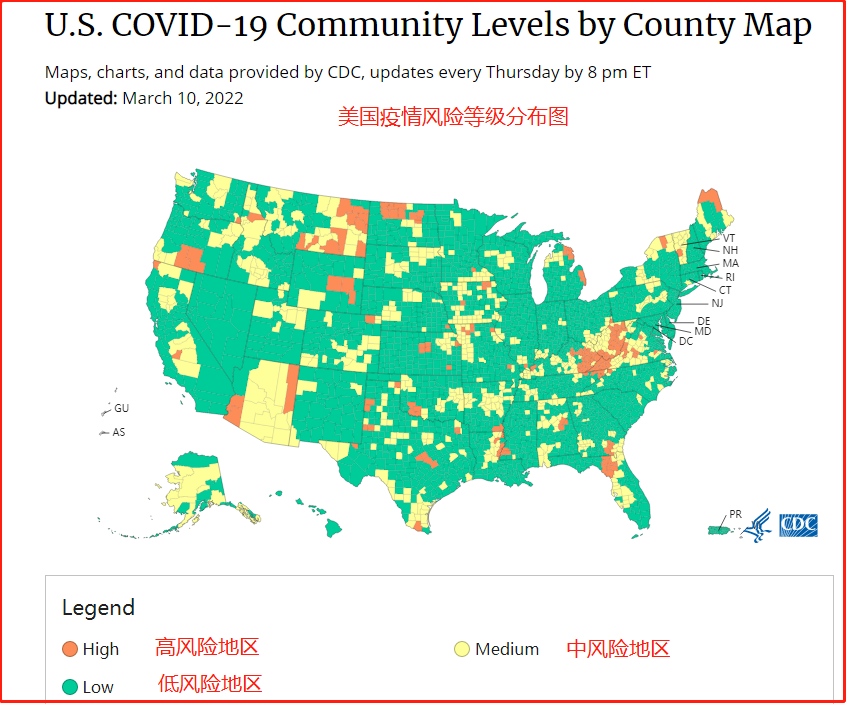 疾病控制和预防中心(CDC)将美国各地划分为高风险、中风险、和低风险地区。