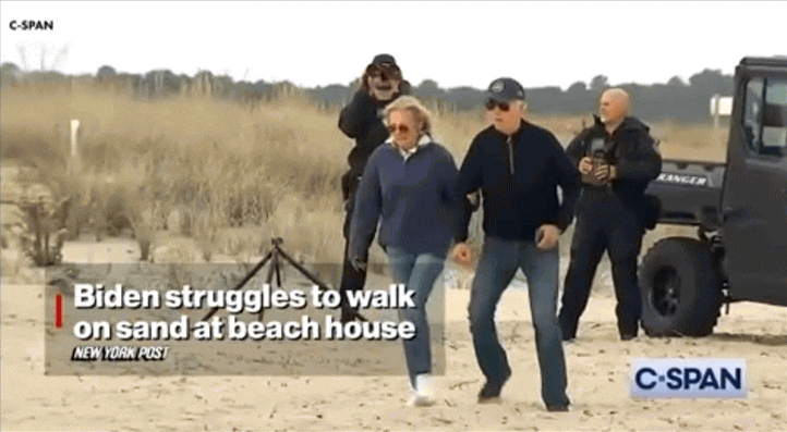 然而,周日,当上述“疯狂计划”传出时,拜登总统被拍到在特拉华州海滨别墅附近的沙地中行走时多次差点跌倒,甚至需要第一夫人吉尔·拜登的搀扶。