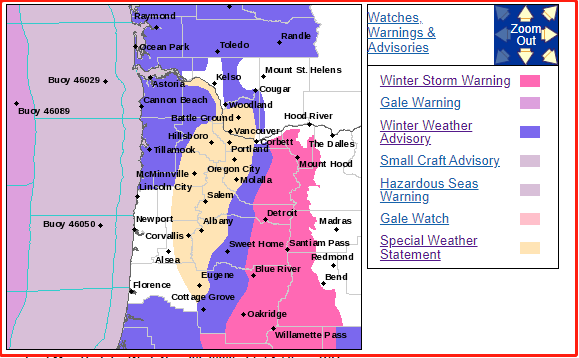 俄勒冈州喀斯喀特山脉的暴风雪红色警报已经生效,将持续到星期四凌晨4点。影响的城市包括Government Camp, Detroit, Santiam Pass, McKenzie Pass, McKenzie Bridge, Oakridge, 和 Willamette Pass。