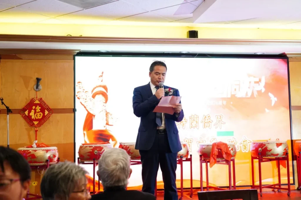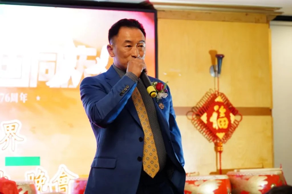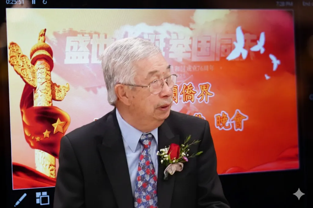 萃胜工商会元老兼晚会副主席温绍俭发表热情洋溢的致辞。他首先向中华人民共和国驻旧金山总领馆的杨守征副总领事、姚瑶领事及宋雨桐领事,以及各位侨团首领与社会贤达致以诚挚欢迎。温绍俭以幽默开场,自称原本准备了长达四十五页的演讲稿,后来才“浓缩”到两页,引来全场笑声。随后,他深情回顾中华民族五千年的悠久历史,指出中国自古便是周边国家的中心,因而得名“中国”,并盛赞中国四大发明对世界文明进步的巨大贡献,赞美中国人民自古以来崇尚和平的优良传统。他谈到近代晚清积弱,遭西方列强入侵的屈辱历史,继而讲到孙中山推翻满清、毛泽东在天安门城楼上宣布新中国成立的伟大时刻。温绍俭感慨,中国人民在无数困难与挫折中顽强奋斗,苦苦探索强国之路,最终成就了今日的辉煌,成为世界第二大经济体,令人无比自豪。他并赞扬全国五十六个民族相亲相爱、团结一致的精神,最后与全体炎黄子孙一同祝愿祖国与天地同寿、繁荣昌盛,祈愿世界永久和平。