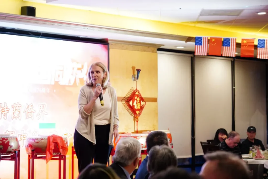 摩特诺玛县第3区议员朱莉娅·布里姆-爱德华兹(Julia Brim-Edwards)致辞表示,非常荣幸受邀出席这场庆典,并特别向来自中华人民共和国驻旧金山总领事馆的贵宾致以热烈欢迎。她感谢副总领事的精彩致辞,赞同其对中美关系重要性的强调,并表示能在波特兰迎接这样重量级的来宾深感荣幸。朱莉娅回顾自己在公共服务及职业生涯中多年来与中国保持友好交流的经历,强调中美两国之间的深厚友谊与紧密联系对双方意义重大。她也分享了作为本区居民和县议员的自豪感,称这片社区是自己的家园,并希望借此良机与大家一同庆祝中华人民共和国成立七十六周年和中秋佳节,向在场嘉宾致以节日的美好祝福。