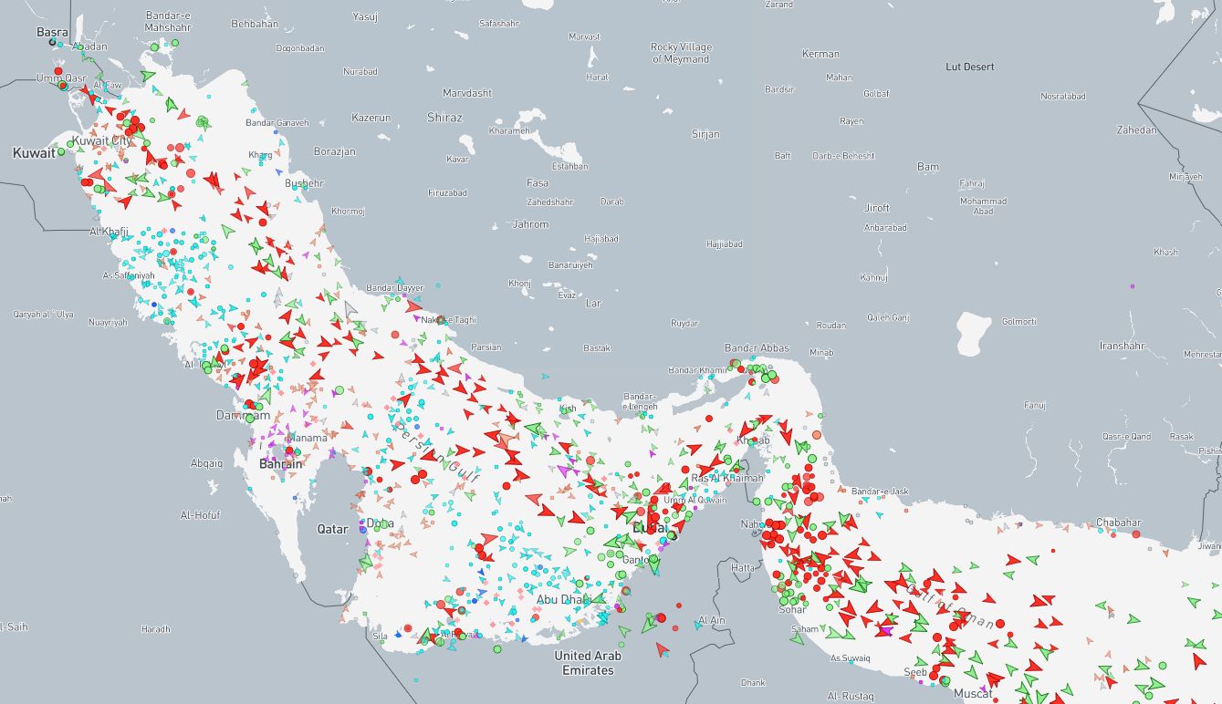 根据实时船舶自动识别系统(AIS)数据显示,目前波斯湾、阿曼湾以及阿联酋外海一带,出现大量油轮与天然气运输船密集聚集的情况。尤其是在霍尔木兹海峡入口附近,不少大型原油运输船(Tanker)出现航向异常,有的减速绕行,有的甚至掉头驶离海峡入口,在外海区域反复徘徊。