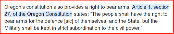 俄勒冈州宪法第 1 条第 27 款规定:人民有权携带武器保卫自己和州(国家),但军队应严格服从民选政府的控制。