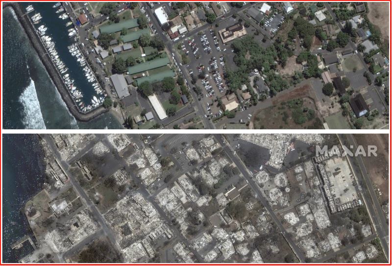 航拍显示,旅游胜地拉海纳镇(Lahaina),社区至少有271座建筑物被大火损坏或摧毁。