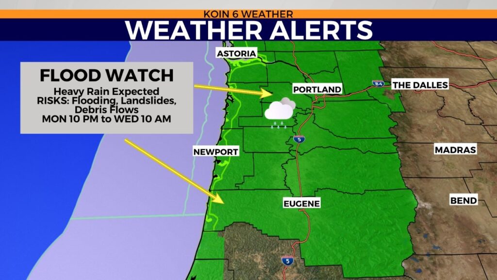 国家气象局已经向俄勒冈州西部和华盛顿州西南部地区发布了洪水警报,警报从星期一晚上10点开始,一直持续到星期三早上。