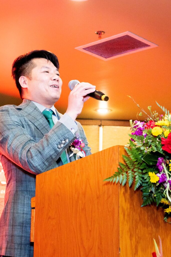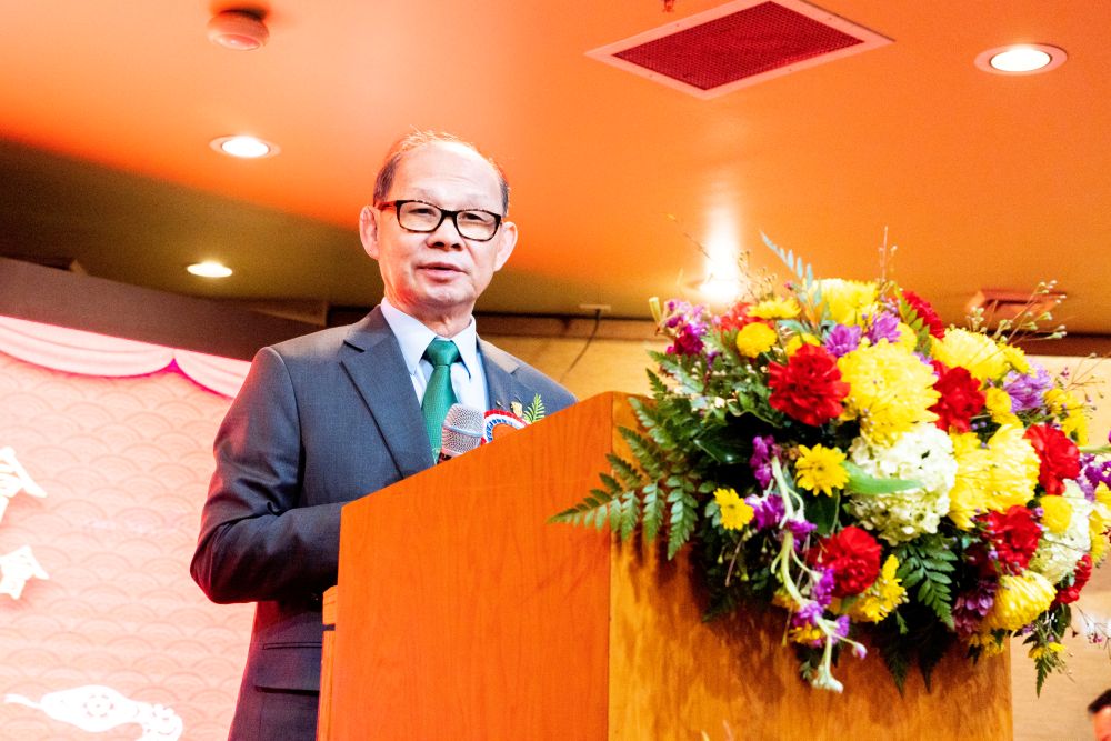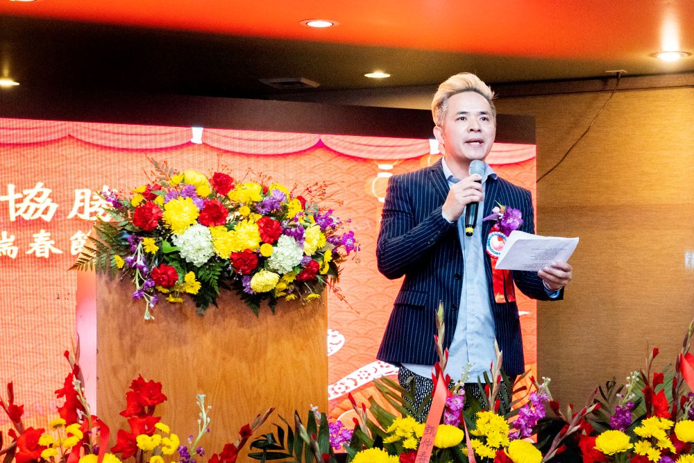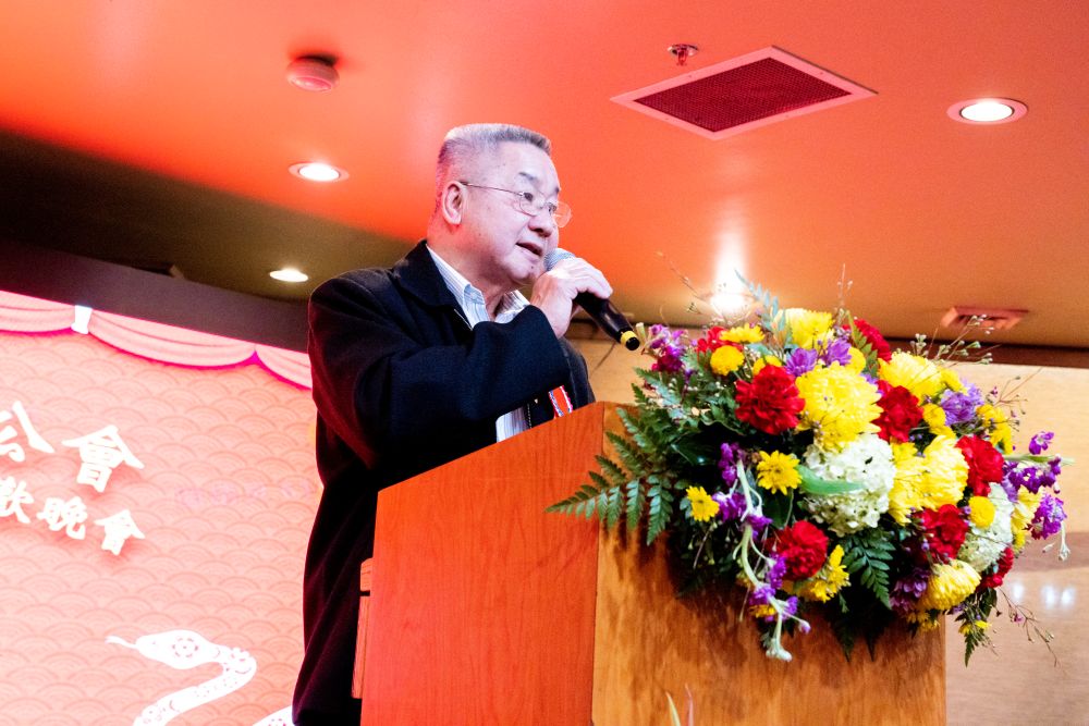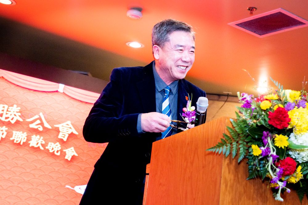 波特兰协胜公会主席甄仲春首先上台致辞,他感谢了大家的到来,并回顾了波特兰协胜公会的历史与成就。他特别提到,公会的前辈们,如陈仕力、李万祥、黄雪莺、陈立德、李绍稳、甄锡祥、马光明、陈岳龄等人,曾筹款8万元,成功修复了唐人街的公会大楼。2019年,波特兰协胜公会再次筹得12万5千元,购买了位于92街的新办公室,方便了更多兄弟姐妹,尤其是年长者的日常活动。甄仲春主席还分享了疫情期间公会的公益行动,包括捐赠医疗物资、为老年人提供帮助等,并展望未来,呼吁更多年轻人加入公会,为华人社群的未来贡献力量。