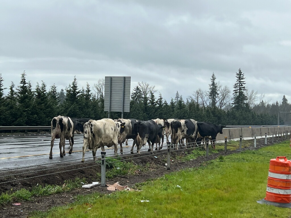 3月13日星期日下午,美国俄勒冈州Wilsonville附近的5号公路一辆载有30多头奶牛的卡车翻车,导致封路3个小时。