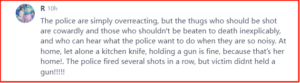 警察简直是反应过度了,开枪的人是懦弱的,不该打死的人莫名其妙地被打死,吵得这么大声谁听得出来警察想干什么。在家里,别说菜刀了,拿着枪都可以了,因为那是她的家!警察连续开了几枪,但受害者没有拿着枪!!!!!!