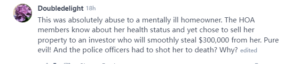 这绝对是对精神病屋主的虐待。HOA 成员知道她的健康状况,但选择将她的财产出售给一位投资者,该投资者将顺利从她那里偷走 300000 美元。纯粹的邪恶!警察非要开枪打死她吗?为什么?