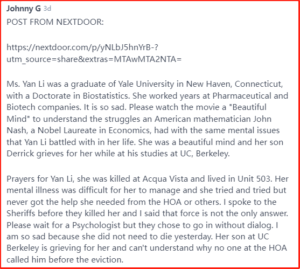 Yan的精神疾病对她来说很难治疗,她尝试多次,但从未在物业管理或或其他人那里得到帮助。在他们杀死她之前,我与警长交谈,武力不是唯一答案,请等待心理学家,但他们选择在没有对话的情况下进入。我很伤心,因为她昨天不需要死。她在加州大学伯克利分校的儿子为她感到悲痛,无法理解为什么在驱逐之前没有人在 HOA 给他打电话。