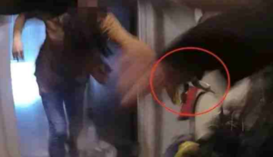 在视频中,Yan站在卧室门后,警察命令她举起双手出来,背景中有狗吠。