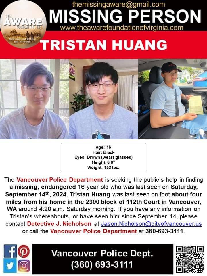 早在9月14日,华盛顿州温哥华警方接到报警,一名16岁少年失踪并处于危险之中。少年名叫Tristan Huang(黄悦),是一名华人男性,身高约6英尺(1.83米),体重153磅,黑发,棕色眼睛,戴眼镜。失踪时衣着不详。