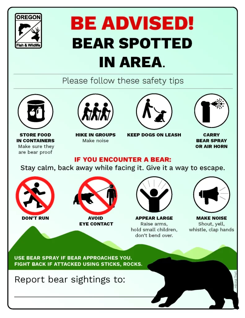 官员还说,任何额外的熊目击事件都应该报告给俄勒冈州鱼类和野生动物部办公室,电话是 (503) 621-3488。