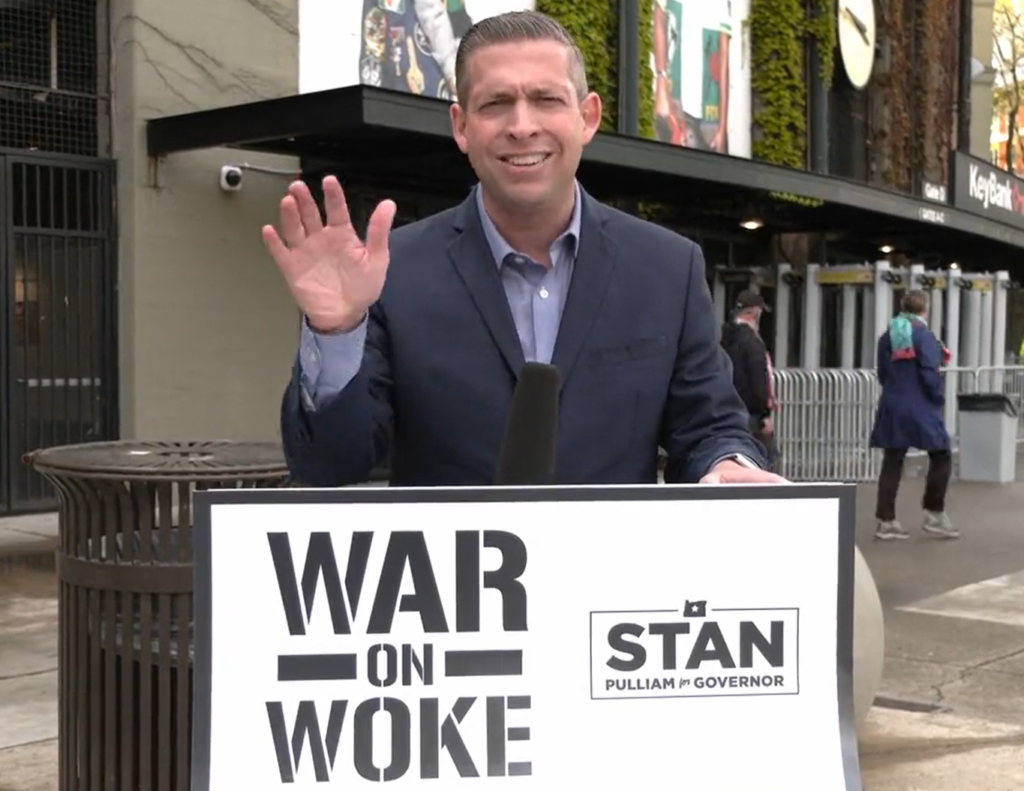 俄勒冈州共和党州长候选人斯坦·普利亚姆(Stan Pulliam)在推特上说,他们在波特兰举行竞选活动,他的支持者在谈论向警察局增加资金。
