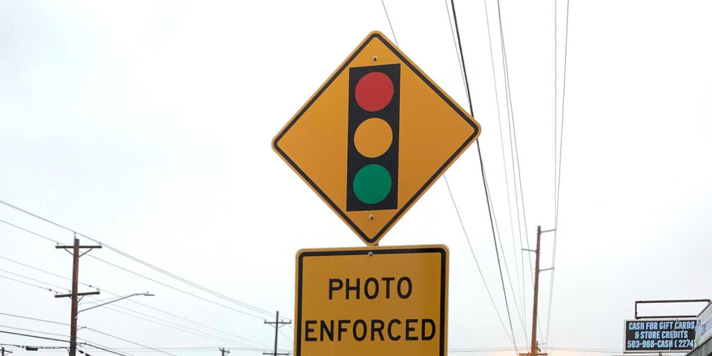 预计“路口安全摄像头”安装后,会像在东南122大道夹Stark街一样,竖立一个醒目的标志提醒:“照片执法”!