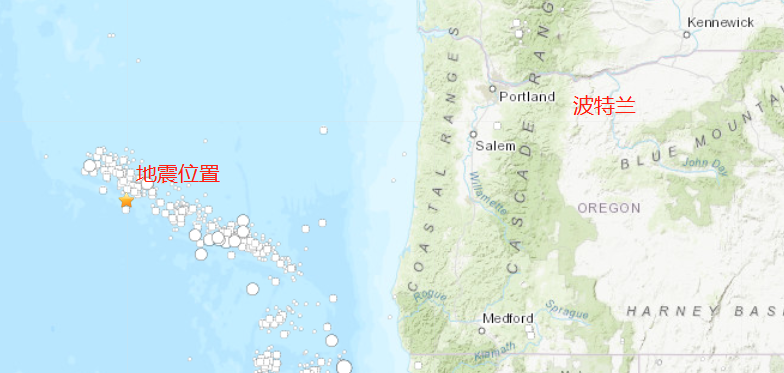 地震发生在距离库斯湾(Coos Bay)约 264 英里、深度 10 公里的地方。