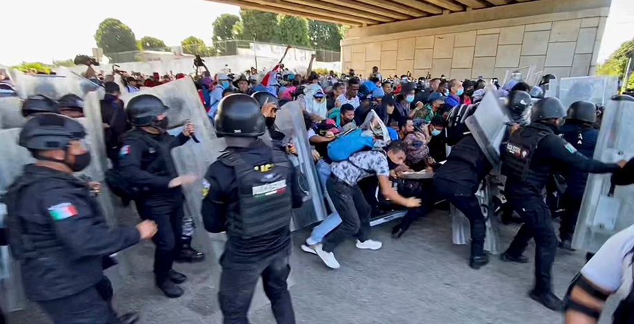 视频显示,人们或背着背包、或扛着孩子、或手挽着手突破身穿防爆装备的墨西哥警察防线,甚至与执法人员发生肢体冲突。