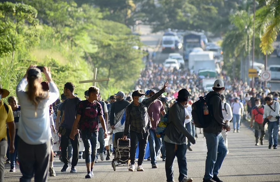 10月23日,大篷车伴随着数万移民集中墨西哥塔帕丘拉,他们高呼“美国适合所有人”!高举支持拜登总统的横幅和美国国旗、标牌写着“拜登为所有人”(Biden For All)!