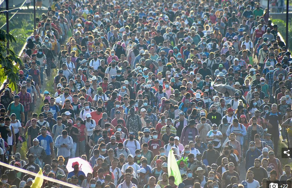 10月23日,大篷车伴随着数万移民集中墨西哥塔帕丘拉,他们高呼“美国适合所有人”!高举支持拜登总统的横幅和美国国旗、标牌写着“拜登为所有人”(Biden For All)!