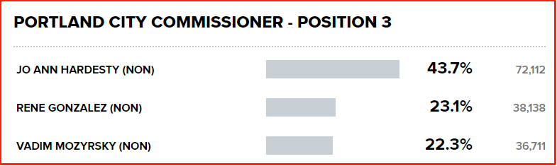 - 乔·安·哈迪斯蒂 (Jo Ann Hardesty)的得票率最高,但没有过半,说明波特兰大多数人是希望乔·安·哈迪斯蒂 (Jo Ann Hardesty)下台;