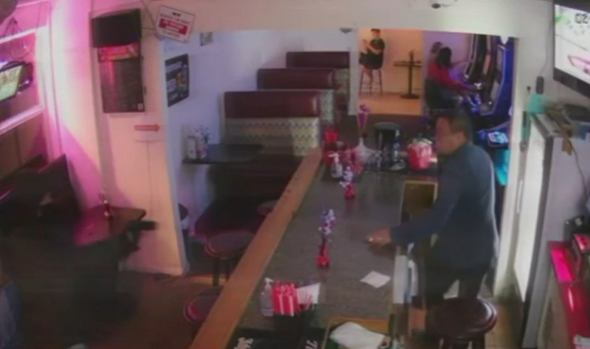 在监控视频中,可以看到一名身穿深色外套和蒙面的嫌疑人走进酒吧,用枪指着Dong Jing要钱财。Dong Jing说,这名男子抢走了大约1500美元。
