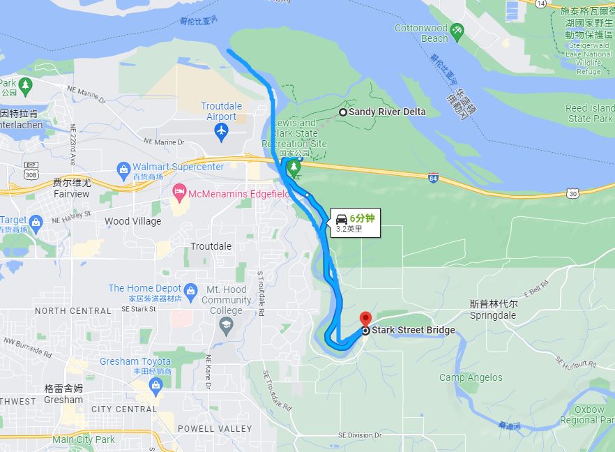 如图所示,桑迪河(Sandy River)河口位于Troutdale市的东边,河口北面就是华盛顿州。Stark街桥而是Stark街横跨桑迪河(Sandy River)。
