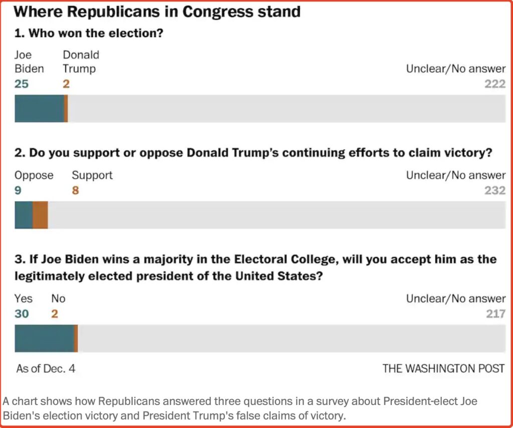 根据《华盛顿邮报》对美国国会所有共和党人进行的一项调查,只有25位共和党人承认拜登在美国总统大选中选出,还有2名共和党议员认为特朗普是赢家,而另外220名共和党议员没有说谁赢得大选。
