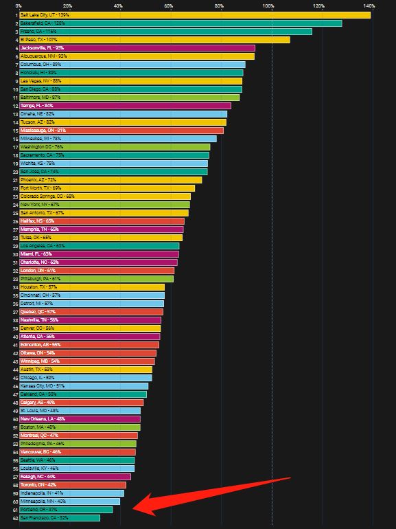 这份基于手机数据的最新季度报告表明,过去三年,波特兰市中心的人流量并没有太大的增长,在62个北美主要城市中,排名垫底或接近垫底。
