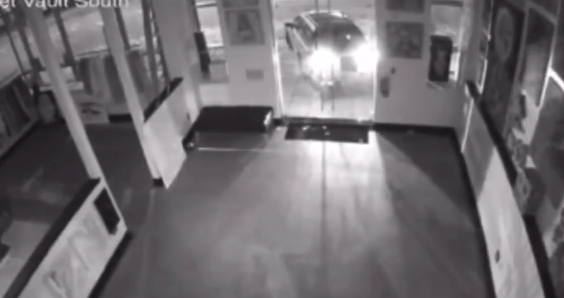 视频显示,盗贼直接用汽车将大门撞烂,再冲进店里大肆搜刮!