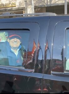 特朗普本人也透过车窗向支持者挥手。镜头一刹那之间,<摩登时讯>前面的读者也看到了特朗普大选后难得的笑脸!