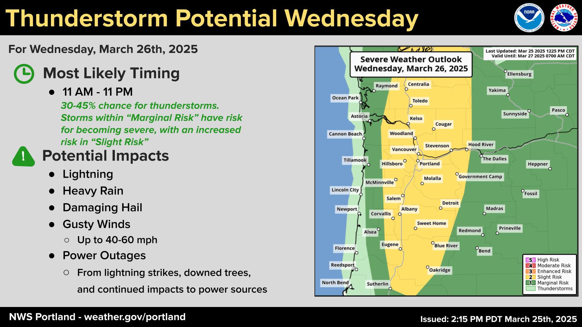 美国国家气象局发布雷暴天气预警,预计 3月26日(周三)上午11点至晚上11点,俄勒冈州西部和华盛顿州将迎来雷暴天气,可能带来 强降雨、冰雹、大风、雷电,甚至龙卷风。