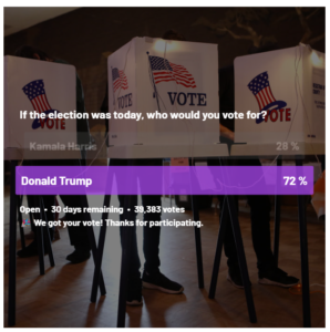 截至10月12日发稿时,由俄勒冈州本土英文媒体katu.com发起的民意调查“如果今天就是选举日,你将投票给谁”中,39410人参与调查,其中支持特朗普的达到72%。