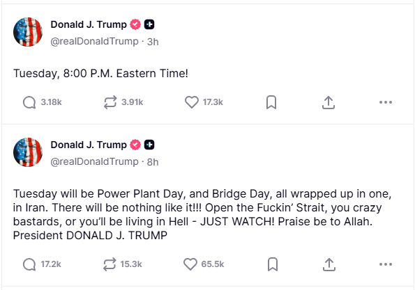 他情绪激烈、措辞粗俗,直接威胁伊朗:如果不在“星期二”前重新开放霍尔木兹海峡,将对伊朗关键基础设施展开猛烈打击。