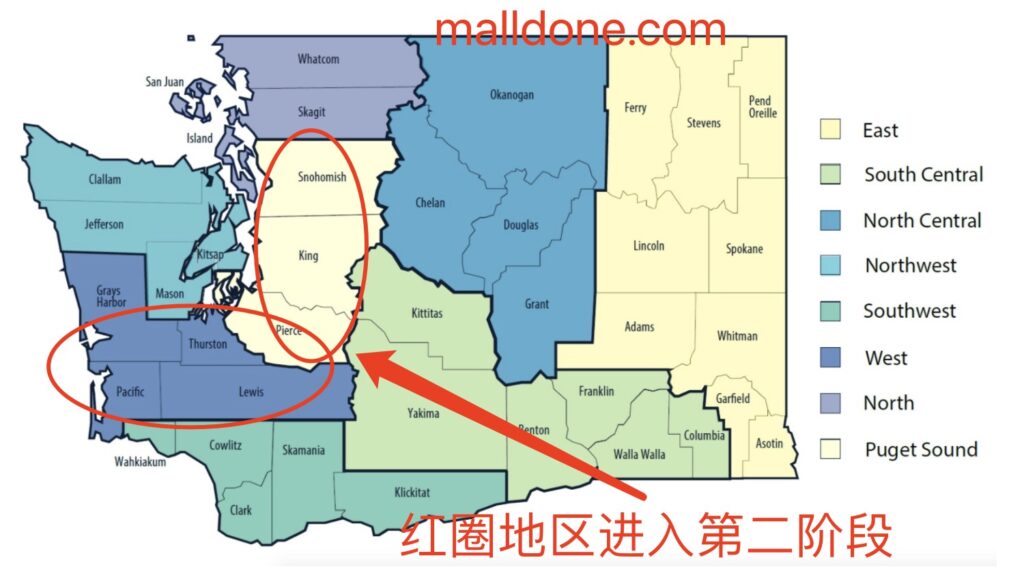 1月28日,华盛顿州州长英斯利宣布,West和Sound regions两个地区(红圈处)获准进入第二阶段,2月1日生效。