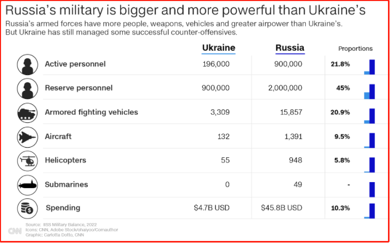 世界新闻 乌克兰和俄罗斯的军力比较 by Malldone2022年2月26日 全副武装的俄罗斯军队正在迅速向乌克兰首都基辅推进,美国官员警告说,这座城市可能会在几天内沦陷。 以下是两国的军力比较。 国防开支:乌克兰47亿;俄罗斯458亿。 兵力:乌克兰现役19.6万,预备役90万;俄罗斯现役90万,预备役200万。 武装和车辆:乌克兰有3309辆装甲车;俄罗斯拥有超过15857辆装甲战车。乌克兰飞机128架;俄罗斯1391架。乌克兰直升机55架,俄罗斯821架。俄罗斯有49艘潜艇,乌克兰没有。 同类报道或信息来源:cnn.com ShareShare