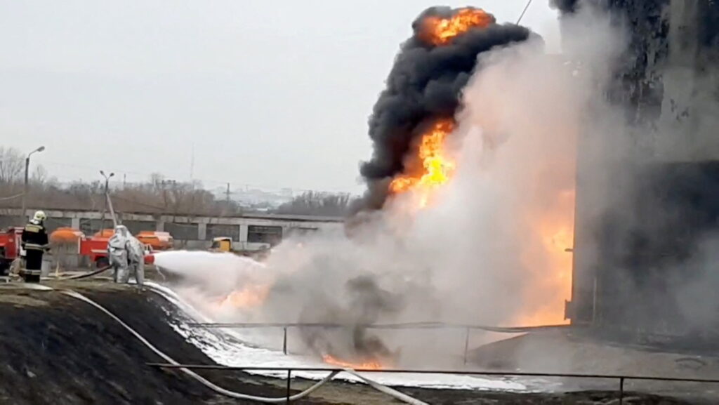 4月1日,早上6时左右,两架据称是乌克兰的直升机,从低空进入俄罗斯领土别尔哥罗德市,对俄罗斯石油公司一燃料库发动袭击。