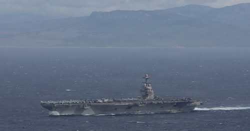 “福特号”是全球最大、最先进的航空母舰,于2017年服役,舰上约有5000名官兵,可搭载超过75架军机,包括F/A-18“超级大黄蜂”战机和E-2“鹰眼”预警机。