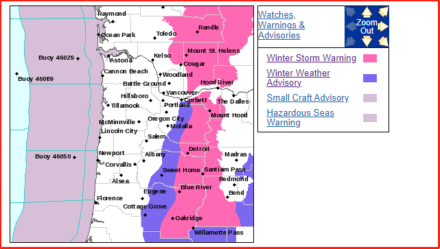 Sandy, Estacada, Silver Falls State Park, Sweet Home, Vida, Jasper, Lowell, 和 Cottage Grove等城市将会降雪,积雪可能有5至10厘米厚。