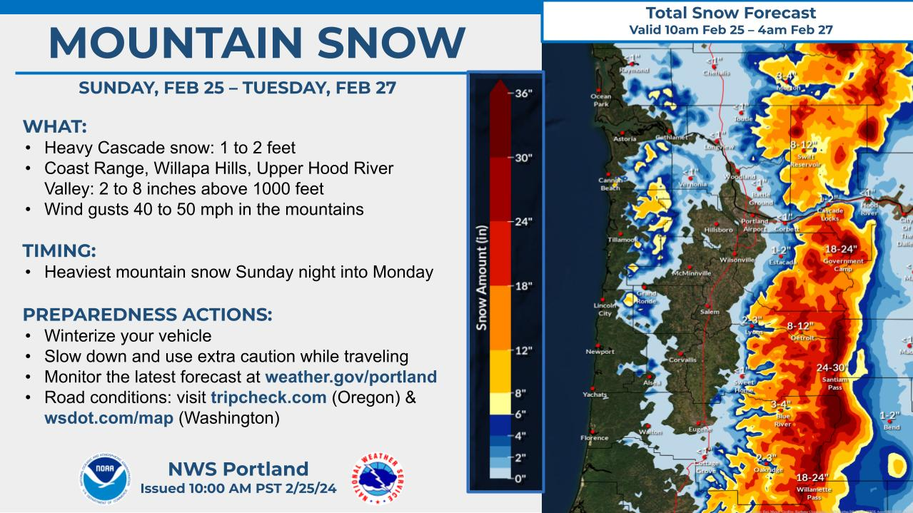 在俄勒冈州的海边山脉地区,冬季天气警告星期日晚上7点生效,海拔 1000 英尺(304.8 米)以上地区也会降雪,积雪量为2至6英寸(5.08至15.24厘米)。